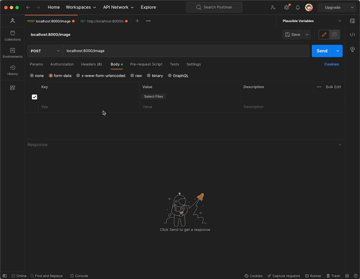 Now open your Postman desktop app and run add this URL http://localhost:8000/image to perform your POST request.